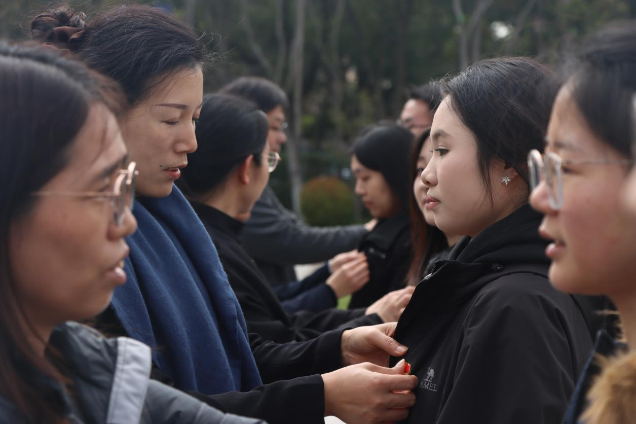 祭扫仪式后,一场庄严的新发展学生党员佩戴党徽仪式在烈士纪念碑前举行,为此次祭奠活动注入了浓厚的党性教育内涵。一路见证与陪伴学生党员成长的教师党员庄重地为6位新党员佩戴党徽并附以殷殷嘱托,新党员身姿挺拔,凝视胸前鲜红的党徽,将沉甸甸的信仰别在左胸、把红色印记深植于心。