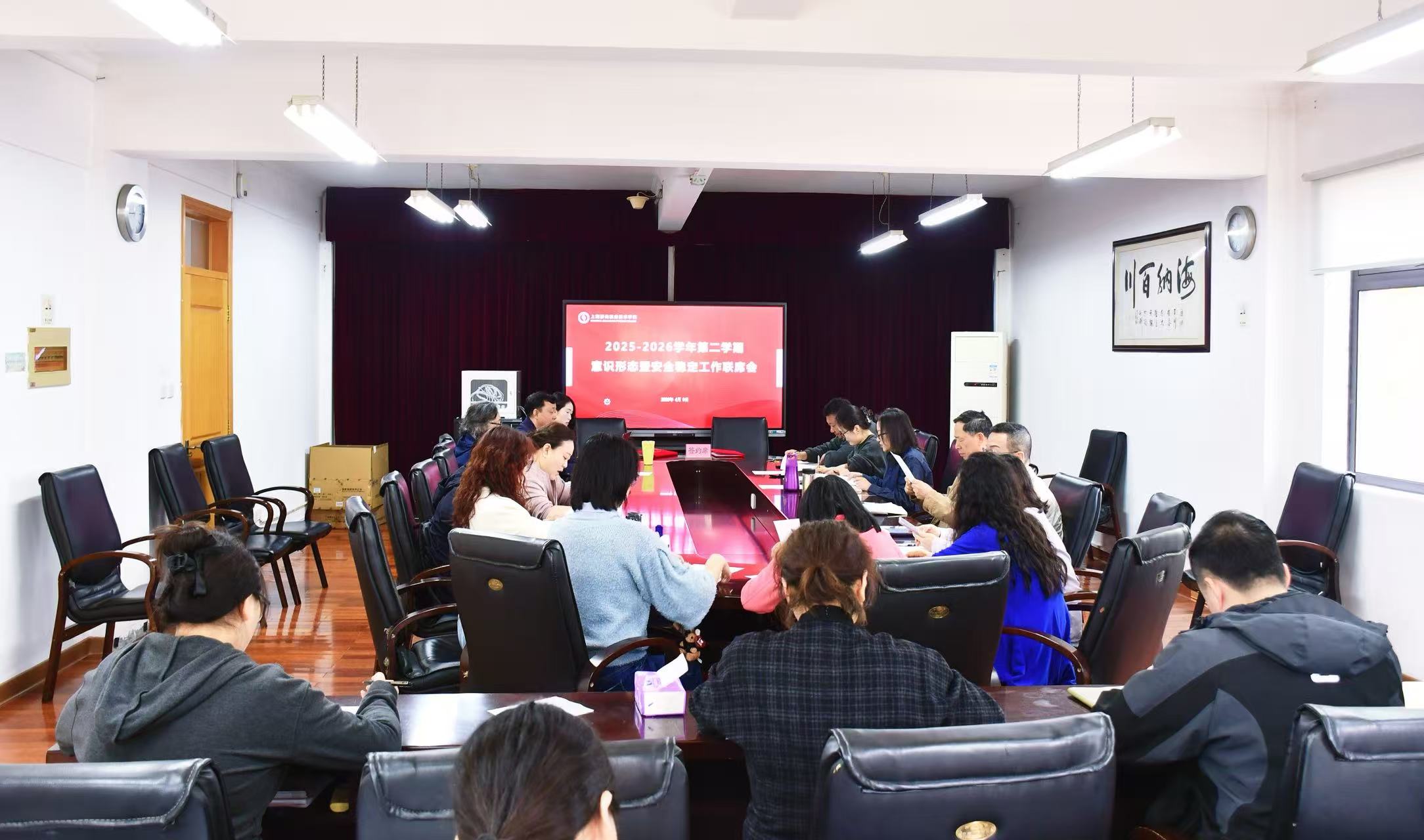 4月9日,学校在办公楼213会议室召开2026年第二季度意识形态暨安全稳定工作联席会第一次会议,全面总结第一季度意识形态与安全稳定工作,分析研判当前形势与风险隐患,部署下一阶段重点任务。校党委书记姜富明、党委副书记刘丽、副校长王云飞出席会议,学工部、教师工作部、宣传部、组织部、后保处、教务处、团委、信息中心、工会、图书馆、继续教育学院、杨浦校区管委会负责人,各基层党总支、直属党支部书记参加会议。会议由党委副书记刘丽主持。
