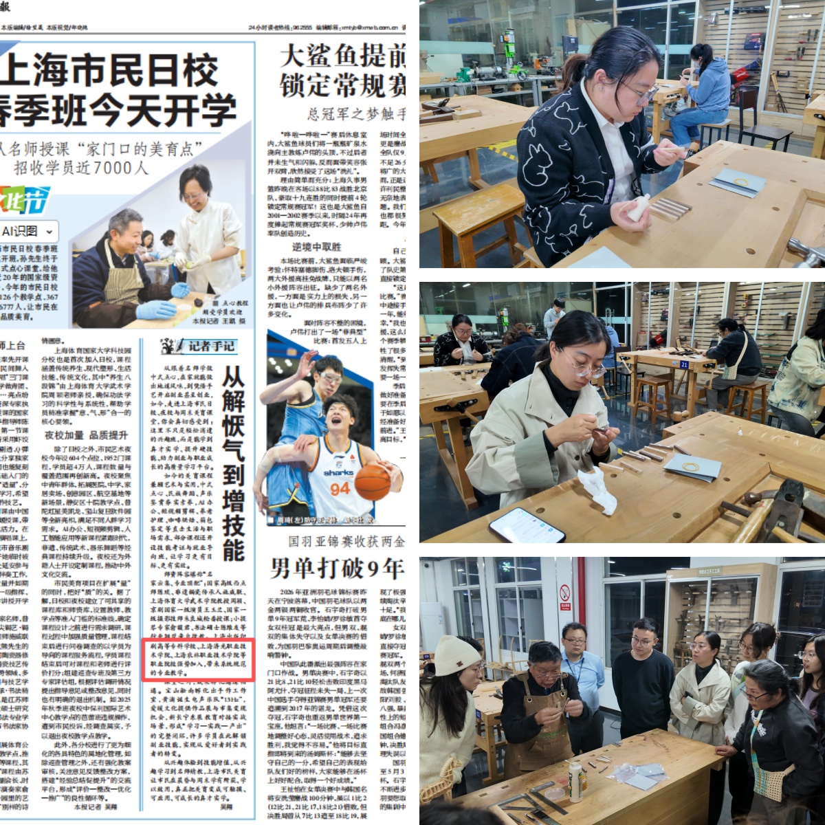 4月13日,上海市民艺术夜校春季班正式开班。我校城市空间数智学院木工大师工作室作为新增课程正式加入市民夜校项目,推出《榫卯结构与木艺课程》特色项目,受到社会广泛关注。相关情况获《新民晚报》报道,彰显学校服务社会、传承中华优秀传统文化的责任担当。