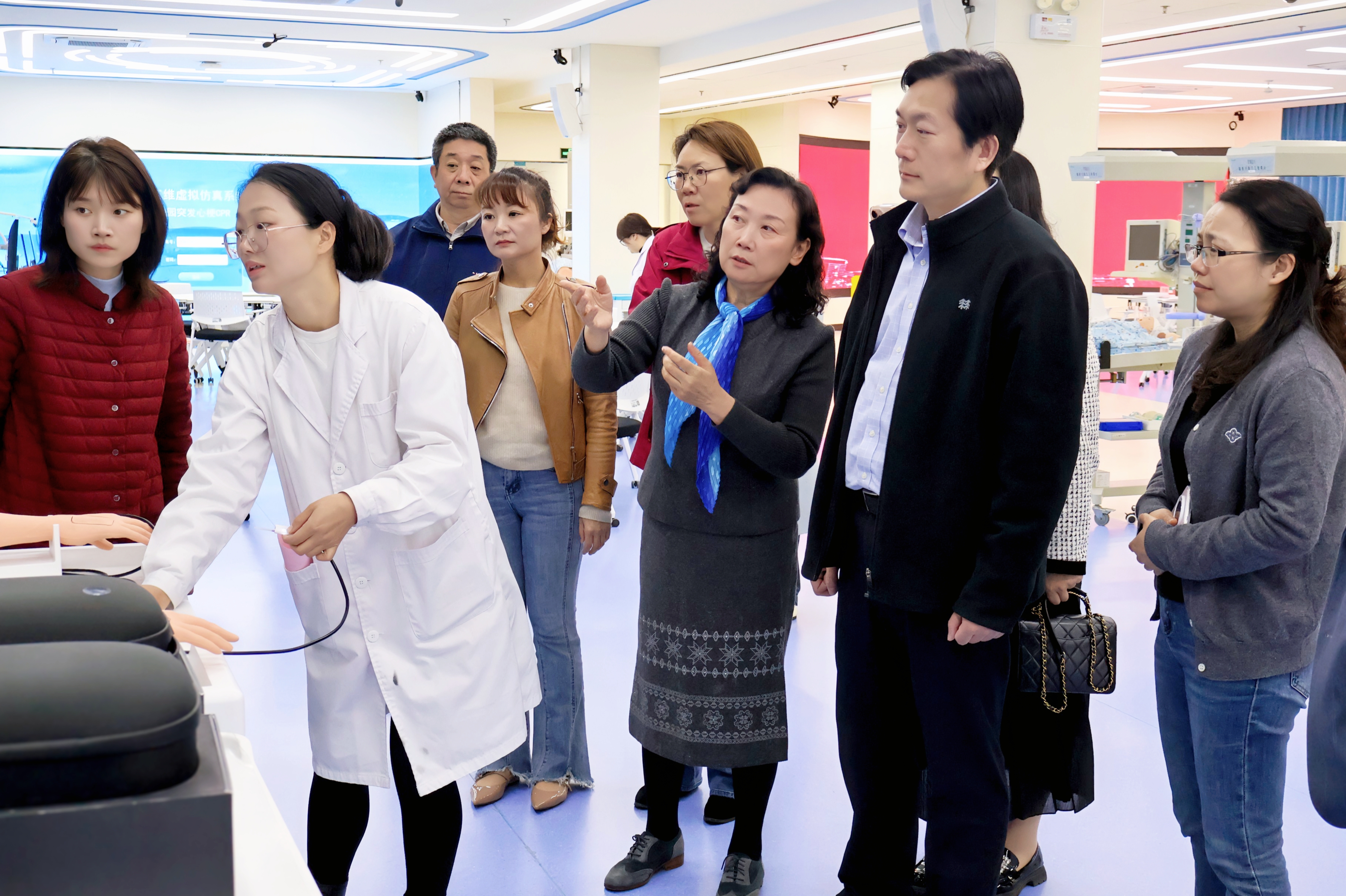 会前,与会人员共同参观了9楼虚拟仿真实训基地,实地了解护理学院的现代化实训条件与创新教学模式。