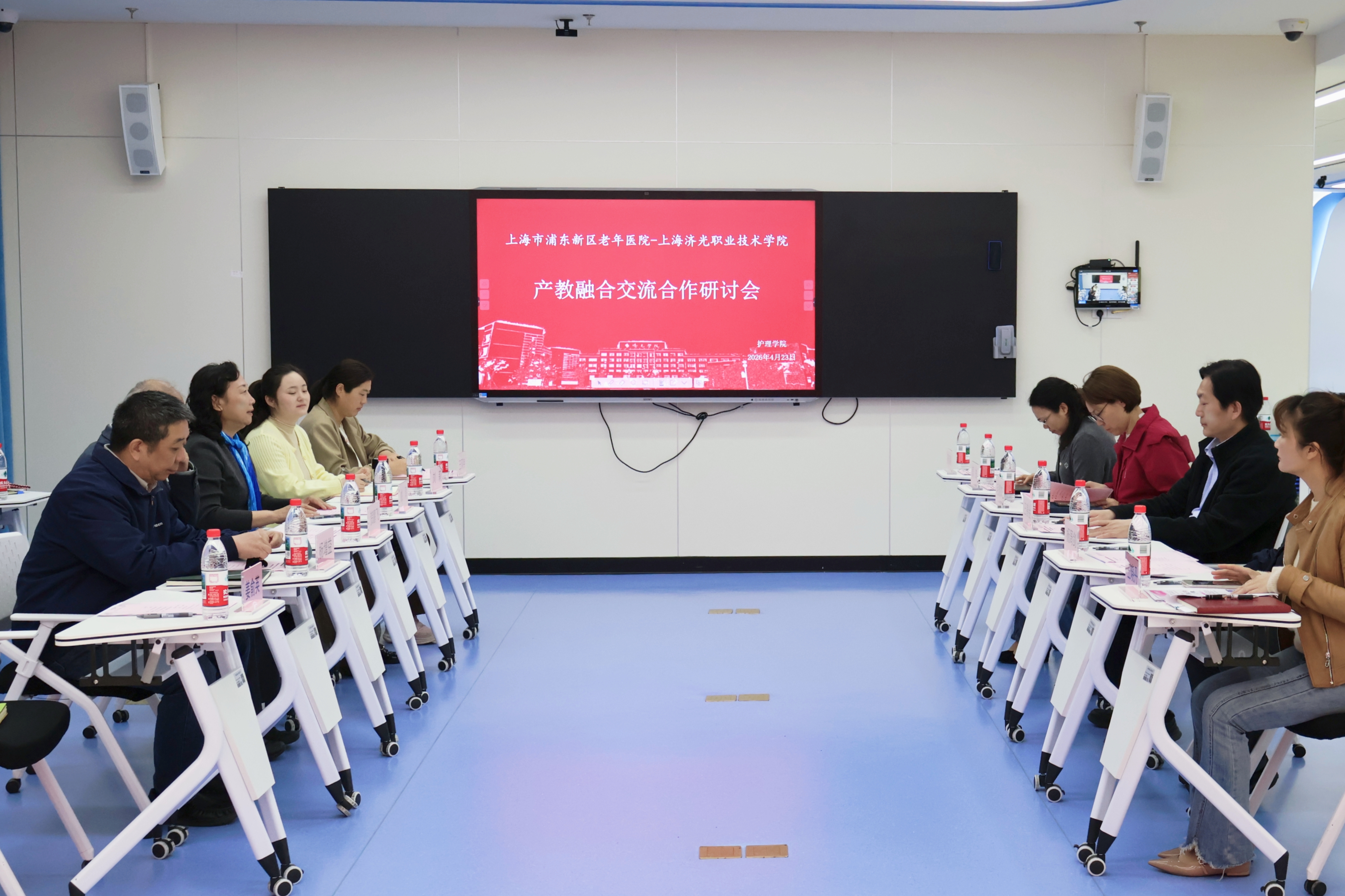 为进一步加强院校合作,推动养老服务与护理教育协同发展,4月23日下午,我校与上海市浦东新区老年医院产教融合交流合作研讨会在实训中心9楼智慧教室顺利召开。浦东新区老年医院院长王善金、党总支副书记毛慧杰、副院长杨周剑、医务部主任周琦、科研教学部主任王晓丹、护理部副主任祝春满;我校校长、党委副书记贺鹏飞,护理学院常务副院长姚淳、教务处副处长杨增益等相关人员出席会议。